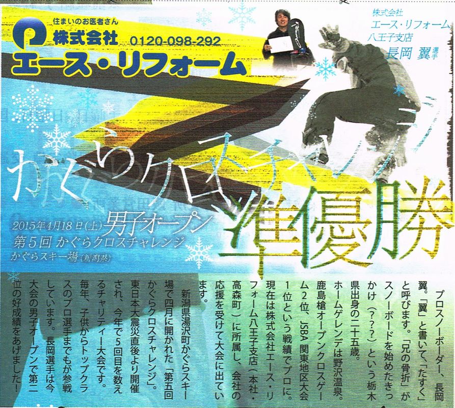 エース・リフォーム八王子支店の長岡翼(たすく)社員が、4月18日に行われたスノーボードの全国大会「第5回かぐらクロスチャレンジ(男子オープン)」(新潟県湯沢町かぐらスキー場)で準優勝を収めました。